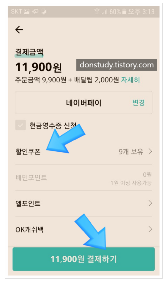 4. 쿠폰을 잘 다운 받았다면 이제 원하는 음식을 장바구니 담고, 주문하는 페이지로 이동한다. 이때 결제 페이지로 넘어가기 전에 위 사진처럼 <할인쿠폰>란을 터치한 다음 첫주문쿠폰을 선택해 할인을 적용해야만한다. 그러면 본래 내가 결제해야하는 금액에서 쿠폰 금액만큼 절감된 금액이 하단의 배너에 재계산되서 뜨게 된다.