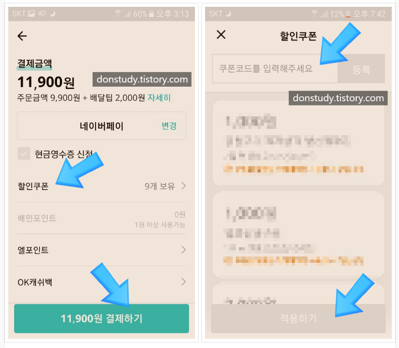 1. (이전의 과정은 앞전에 설명한 것을 참조) 음식을 주문하고, 최종 결제하기 전에 위사진 왼쪽화면처럼 할인쿠폰 란을 선택한다. 그리고 오른쪽 사진의 상단처럼 쿠폰코드란에 06OAD90S 라고 입력하고 <등록>버튼을 눌러주면 된다. 그러면 내가 지불해야하는 금액에서 -5000원을 할인받을 수 있다.