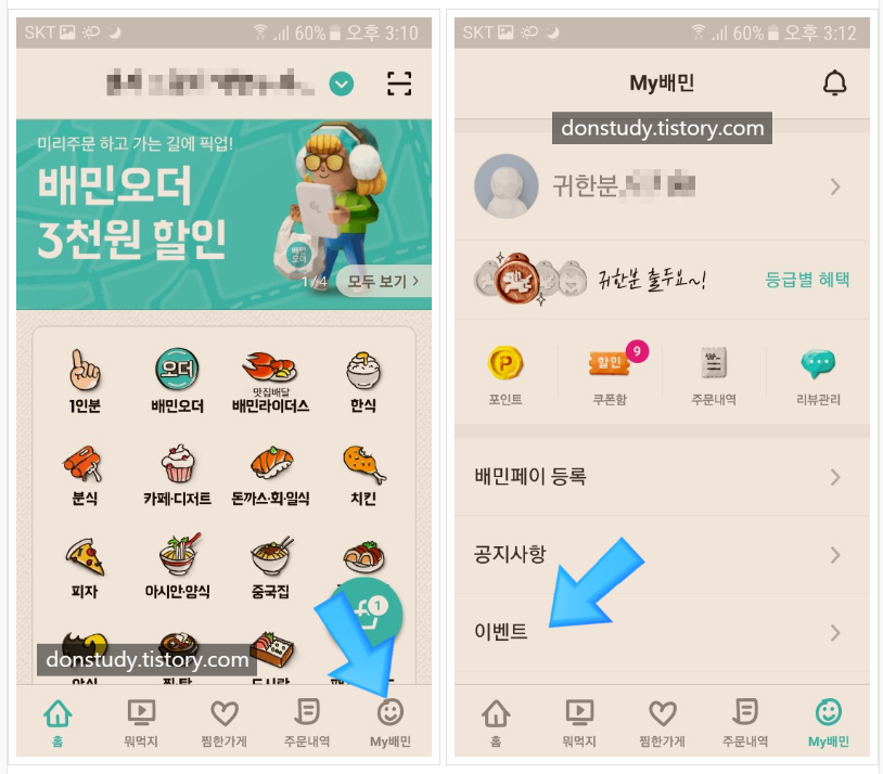 위의 왼쪽사진처럼 앱 메인화면에서 오른쪽 하단의 my배민을 터치한다. 그리고 오른쪽사진처럼 '이벤트'란을 터치한다.