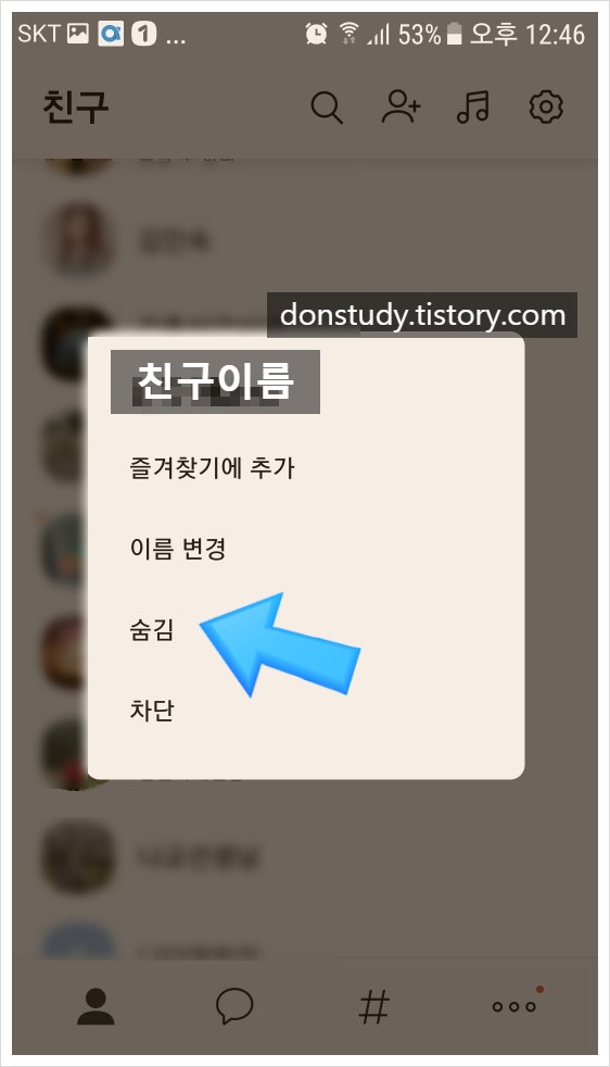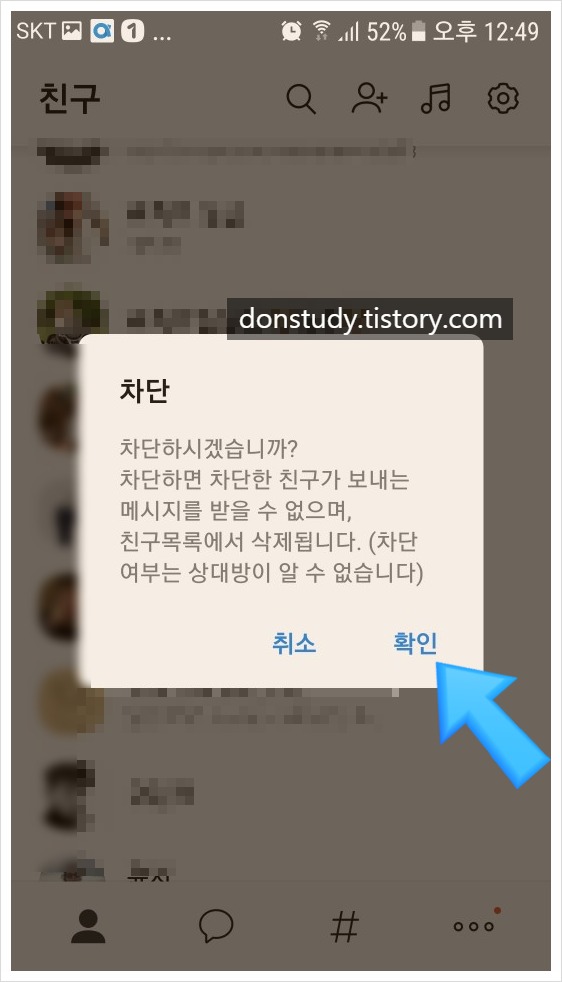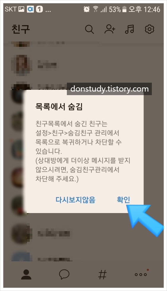 4. 최종적으로 <확인>버튼을 누르면 카톡 메인화면에서 그 친구의 이름은 사라지게 된다.