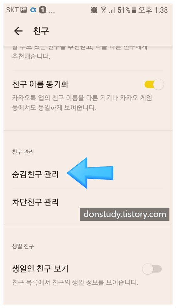 2. 다음에 나오는 화면에서 밑으로 쭉 내려오면 친구관리 란에 <숨김친구 관리>와 <차단친구 관리>가 나온다. 여기서 내가 복구하고자 하는 친구가 숨김한 친구면 <숨김친구 관리>로, 차단한 친구면 <차단친구 관리>로 들어간다.