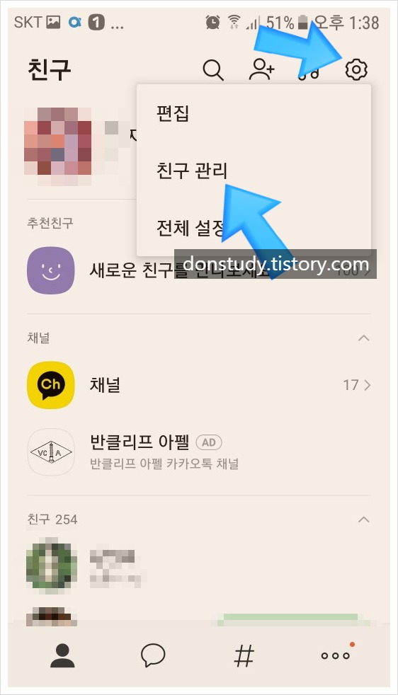 1. 삭제(숨김, 차단)한 친구를 다시 목록에 복구하고 싶은 경우에도 매우 쉽게 할 수가 있다. 카톡 메인화면에서 오른쪽 상단에 설정버튼(톱니바퀴 모양)을 터치하고 뜨는 새창에서 <친구관리>를 터치한다.