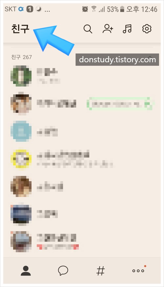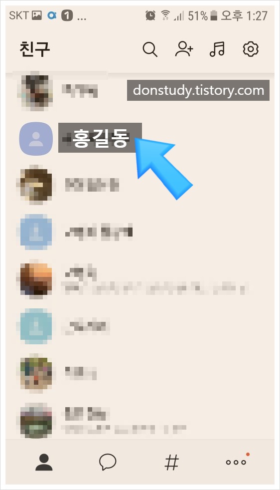 1. 먼저 휴대폰에서 카카오톡 앱을 실행하자. 그리고 메인화면에서 [친구목록]을 확인한다. 쭉 살펴본다음 지우고싶은 사람을 찾는다.